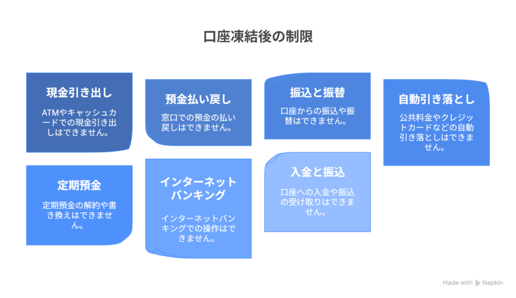 特に自動引き落としが停止されると、公共料金やクレジットカードの支払いが滞る可能性があるため、速やかに引き落とし口座の変更手続きが必要です。