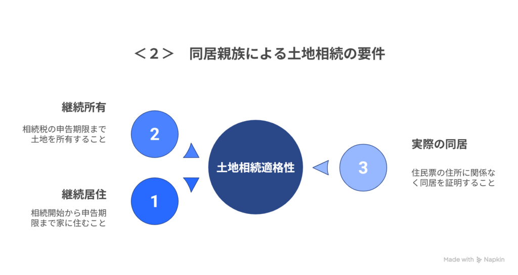 被相続人と同居していた親族が土地を取得する場合、以下の2つの要件を満たす必要があります。