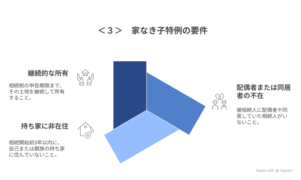 被相続人と別居していた親族でも、一定の条件を満たせば「家なき子特例」として適用を受けることができます。主な要件は以下の通りです。