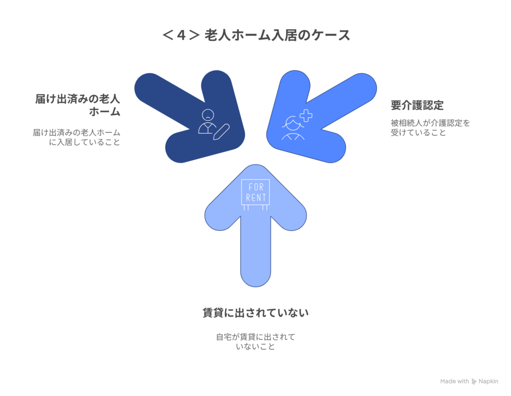 被相続人が老人ホームに入居していた場合でも、以下の要件を満たせば特定居住用宅地等に該当し、特例の適用を受けられます。