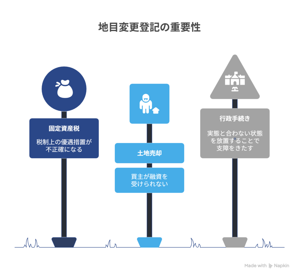 まず、固定資産税の課税に影響します。農地は税制上の優遇措置がありますが、転用後は宅地などとして課税されるべきです。地目変更をしないと、市町村の課税台帳と登記簿の内容が一致せず、後々トラブルの原因となります。