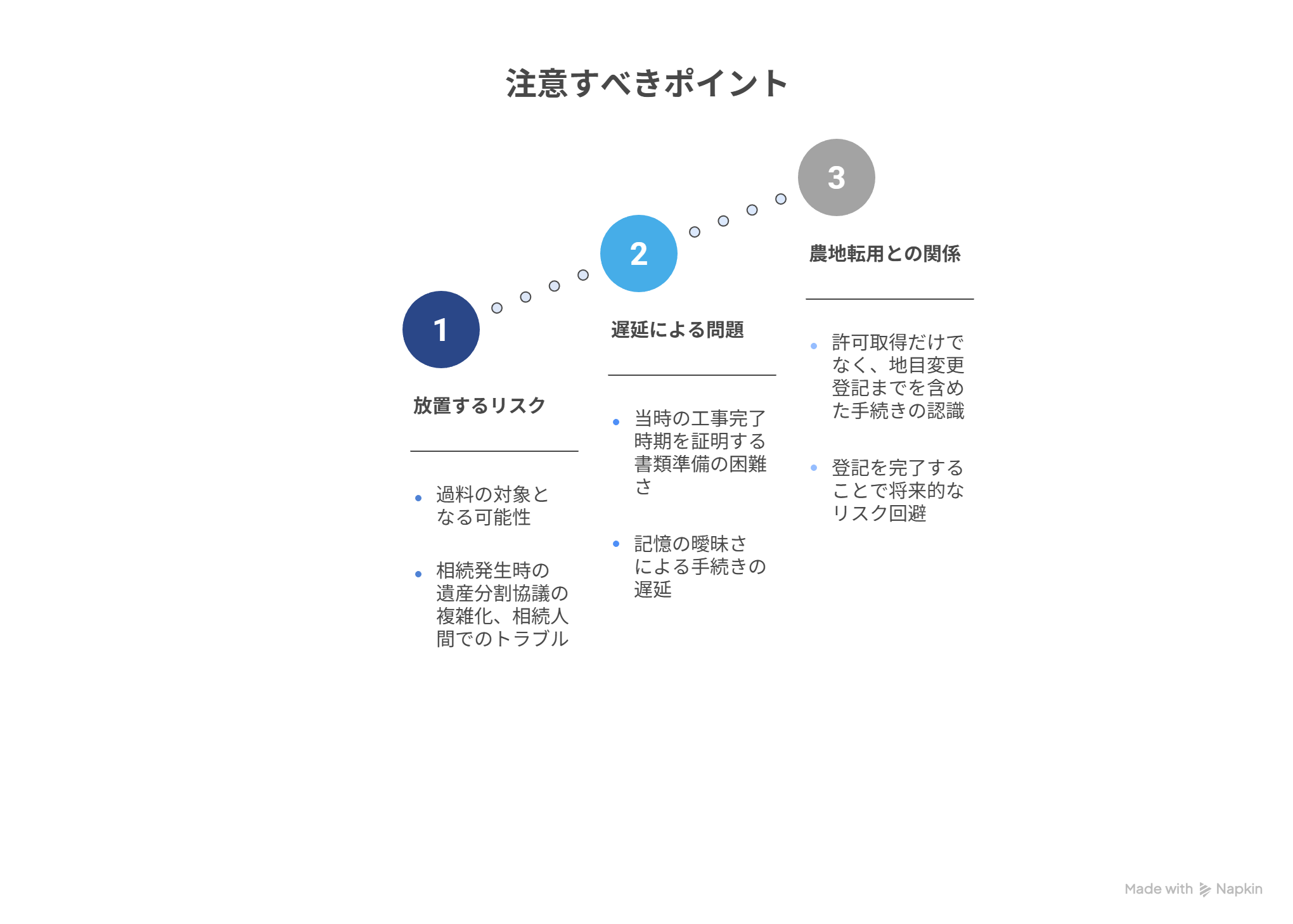 さらに、農地転用許可を得た以上、その土地は農地ではなくなっています。登記簿上も農地のままにしておくことは、実態と合わない状態を放置することになり、様々な行政手続きで支障をきたす可能性があります。