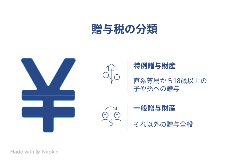 贈与税の税率は、贈与者と受贈者の関係によって「特例贈与財産」「一般贈与財産」の2種類に分かれています。