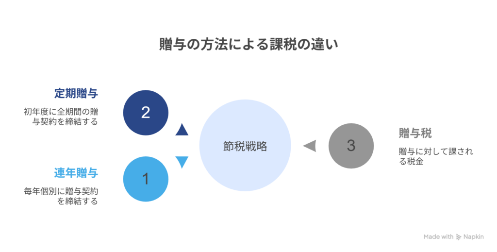 「定期贈与」とは、最初の段階で「一定期間にわたって一定額を贈与する」という約束を取り決め、その契約に基づいて複数年にわたって贈与を実行する方法です。