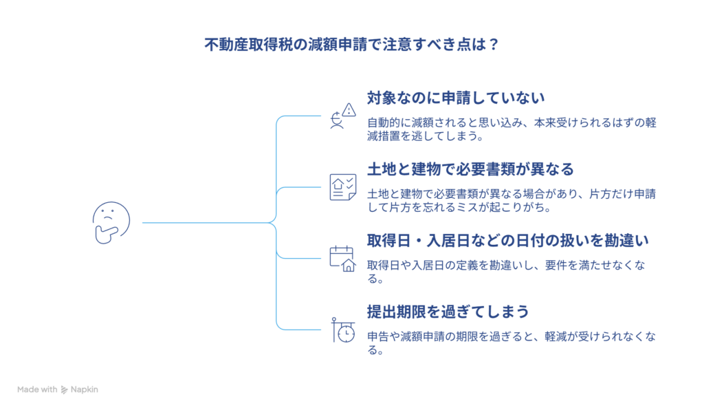 土地と建物では軽減要件や必要書類が異なる場合があり、片方だけ申請して片方を忘れるミスも起こりがちです。