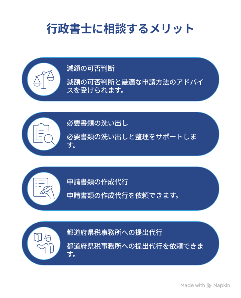 ※軽減要件や提出期限、提出先は都道府県や市区町村によって異なる場合があるため、必ず管轄する都道府県税事務所の案内を確認してください。