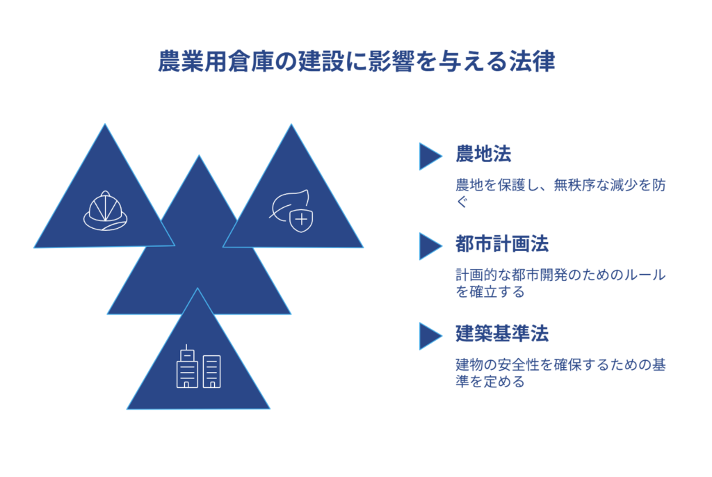 農業用倉庫を建てるときに関係してくる法律は主に3つあります。