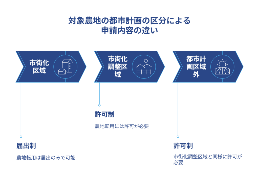 さらに農地が都市計画法上のどの区域にあるかによって、手続きが変わってきます。